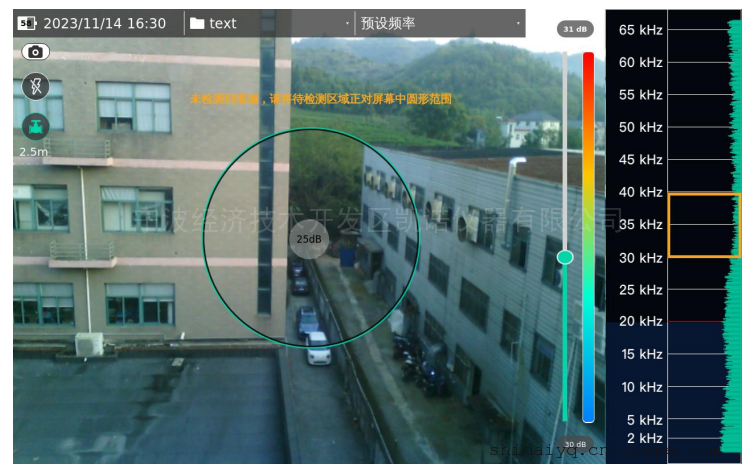 点击主界面左上方⑥位置图标,进入泄露检测模式,泄露功能打开时泄露图标下方显示当前设置的距离泄漏点的距离,泄露界面右侧热力图标识旁新增测试距离设置,拉动滚动条改变测试距离,根据测试时实际情况设置测试距离,测试距离影响计算显示的泄漏量。 在泄露界面测试时,需要将测试对象放到屏幕中圆形区域内才可以成像。