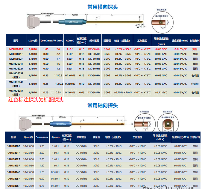 一般分为常规横向探头和轴向探头,也有高精度探头/超高精度探头、一维/二维/三维探头、微间距系列一维/三维探头、耐高低温温度补偿型或定制探头(长度定制、加装温度传感器、组合阵列探头)。