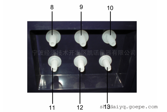 2.碱桶气源出口(8)接碱桶气路管;硼酸气源出口 (9)接硼酸桶气路管;蒸馏水气源出口(10)接蒸馏水桶气路管;碱液接入 口(11)接碱液桶液路管;硼酸接入口(12)接硼酸桶液路管;蒸馏水接入口 (13)接蒸馏水桶液路管。