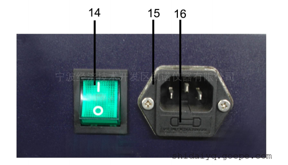 3.电源线接口(15)接电源线,保险丝(16)为更换保险丝的位置(仪器出厂前保险座内有两只保险丝其中备用一只),电源开 关(14)打开,机器即通电工作。