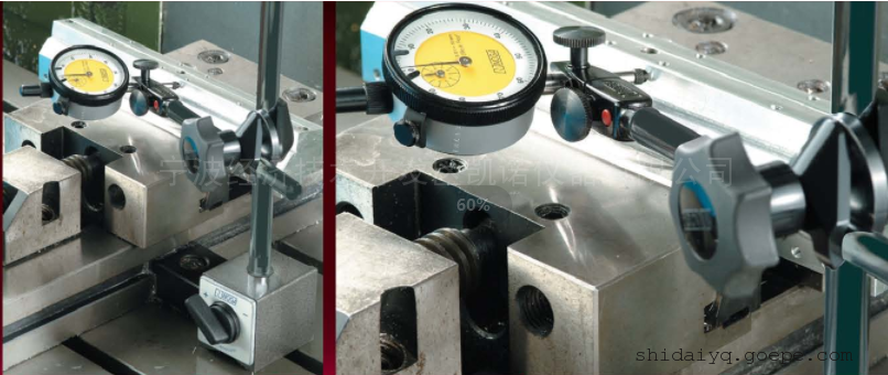 NOGA诺佳表架与百分表的安装示例图如下: 注:百分表安装后,需扣好锁紧装置。并且调整到所需要测量产品合适的距离。