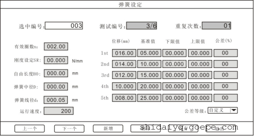 1.测试编号:测试编号*大可设置到32,按“新增”后,测试编号增加一组,输入需要测试的弹簧参数,按“保存”即。。