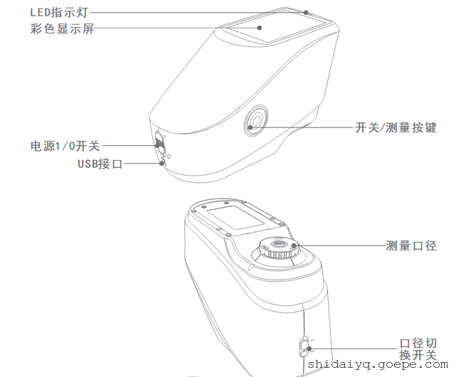 二、YS45系列色差仪外部结构组成说明: (1)电源1/0开关: