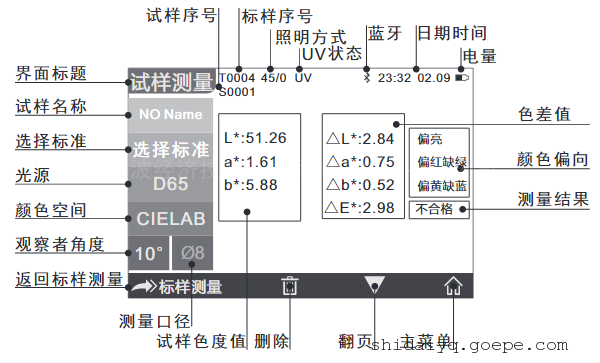 试样测量界面与标样测量界面类似,但会显示当前试样与当前标样的色度数据对比差值。