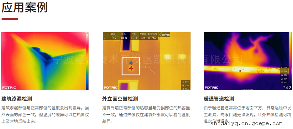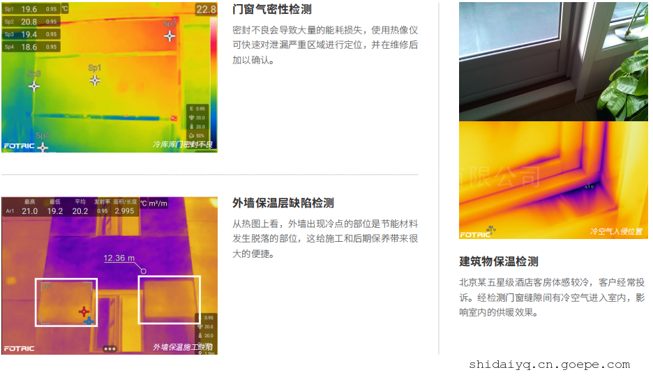 建筑质量检测:建筑渗漏检测、空鼓及外墙饰面缺陷检测、暖通管道泄漏检测;用于建筑渗漏、电气系统、暖通空调系统、管路系统等检测,例如:渗水、外墙空鼓、管道密封不良、电气故障等。