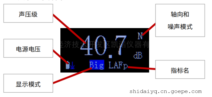 显示屏幕*后1行显示仪器工作状态,从左到右分别显示电源电压、欠载指示、显示模式、显示指标名。此界面下光标可以在“Big"、“LAFP”和“N”处进行设置和切换其他项。按“进入”键开始声暴露测量、统计分析、数据记录、手传振动测量(右下角绿色三角形闪