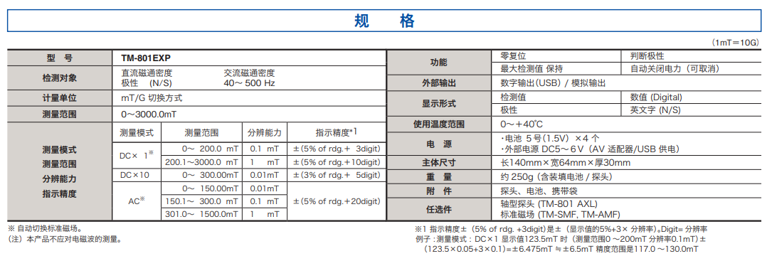 品牌:日本强力 型号:TM-801EXP 加工定制:否 测量范围:0-3000 T 准确度等级:0.1mT 显示方式 :液晶屏 外形尺寸 :140*64*30 mm 整机重量 :0.5 kg TM-801EXP日本强力高斯计