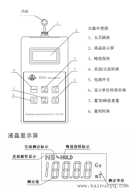 本系列仪器采用的传感器是基于霍尔效应原理制成的传感器,即霍尔传感 器。传感器有横向、轴向两种,用户可根据需求选择或另外配置。电路采用低漂 移的放大器以及高稳定度的供电电源、单片机控制、4½液晶显示。