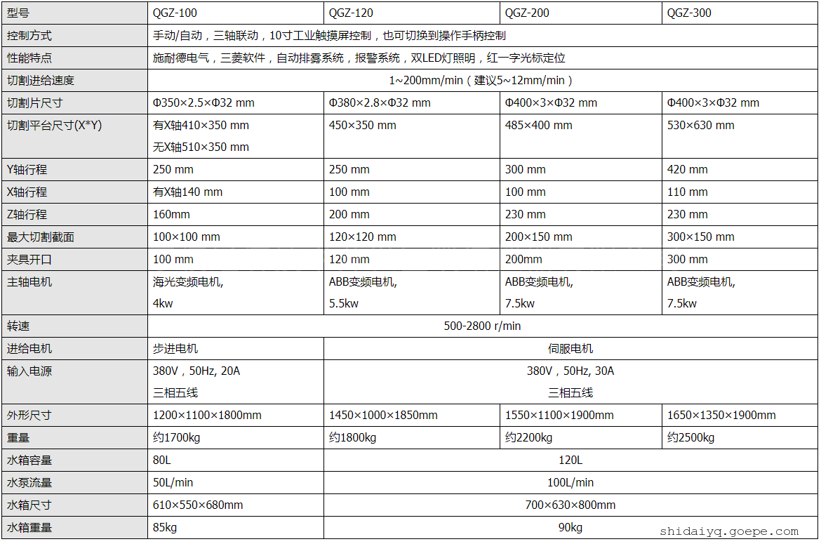 品牌:金相 型号:QGZ-100 切割能力:100×100 空载转速:500-2800 r/min rpm 额定功率:4kw w 额定转速:500-2800 r/min rpm 空载冲数:标准 spm 电源类型:三相五线 电源电压:380v 功率:标准 w 锯片直径:350 mm 最大锯切深度:350 mm 适用范围:金相切割机 重量:1700 kg 大型自动切割机金相QGZ-100