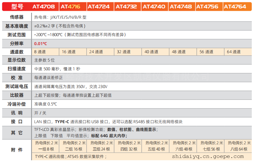 多路温度测试仪AT4716参数规格:分度号 热电偶:J/K/T/E/S/N/B/R型 基本准确度 K 型热电偶