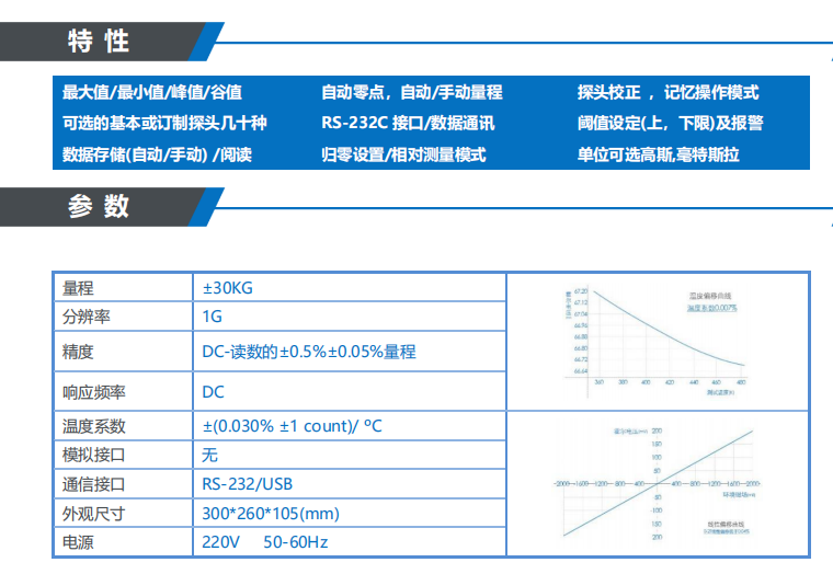 品牌:凯诺 型号:CH-1300 加工定制:否 测量范围:3(±30KG) T 准确度等级:DC-读数的±0.5%±0.05%量程 显示方式 :液晶显示 外形尺寸 :300*260*105 mm 整机重量 :1 kg 数字台式高斯计CH-1300全数字高斯计/特斯拉计CH-1300型是一款经济型高斯计,适合要求较高精度,较高分辨率的磁场测试应用。是较高精度智能化仪器,是集测试、存储、工控、通讯为一体的自动化仪表。CH-1300充分运用微处理器技术,为您提供研究和生产所需的高精度,更高的刷新率及显示分辨率和更高的测量重复性,稳定性。简捷的面板及全菜单操作,4¾位分辨率读数,较高分辨率1/60000,量程为30KG(3T),其大容量数据存储及数据阅读可按存储时间查询。适合全方位的直流磁场测量,数字RS -232接口,广泛的指令集用于二次开发,主要销往研究单位和各类生产单位。可加装工控接口并安装标准机柜中适合生产线配置,全量程1Gs分辨力。可配温度补偿型探头以确保温度变化大的测试环境。