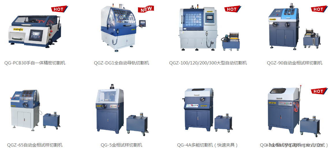 金相切割机系列型号如下:QGZ-DG1自动导轨切割机、QGZ-100/120/200/300大型自动切割机、QGZ-90自动金相试样切割机、QGZ-65自动金相试样切割机、QG-5金相试样切割机、QG-4A多能切割机等等。