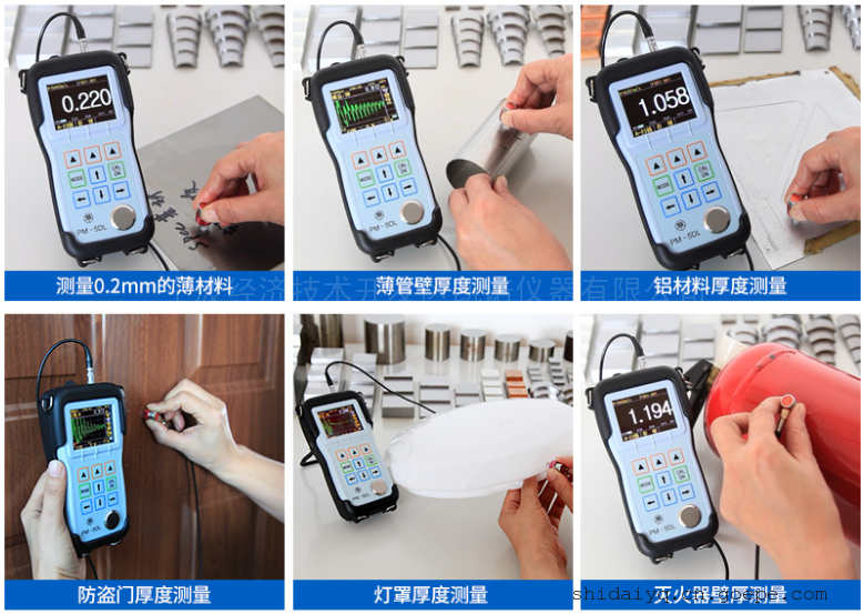 PM-5DL测厚仪采用超声波测量原理,利用单晶延迟探头,从被测工件的一侧向材料内发射声波,对其厚度进行实时的数字化测量,而无需切开被测工件,是一种超小型测量仪器。能快速,无损伤,精确地进行测量。PM-5DL系列测厚仪可广泛应用于金属材料厚度的测量。针对薄件测量和高精度测量,更见其优越性。本仪器还可穿透较薄的涂层,漆层,可用于灭火器等带有漆层的超薄壁的测量。