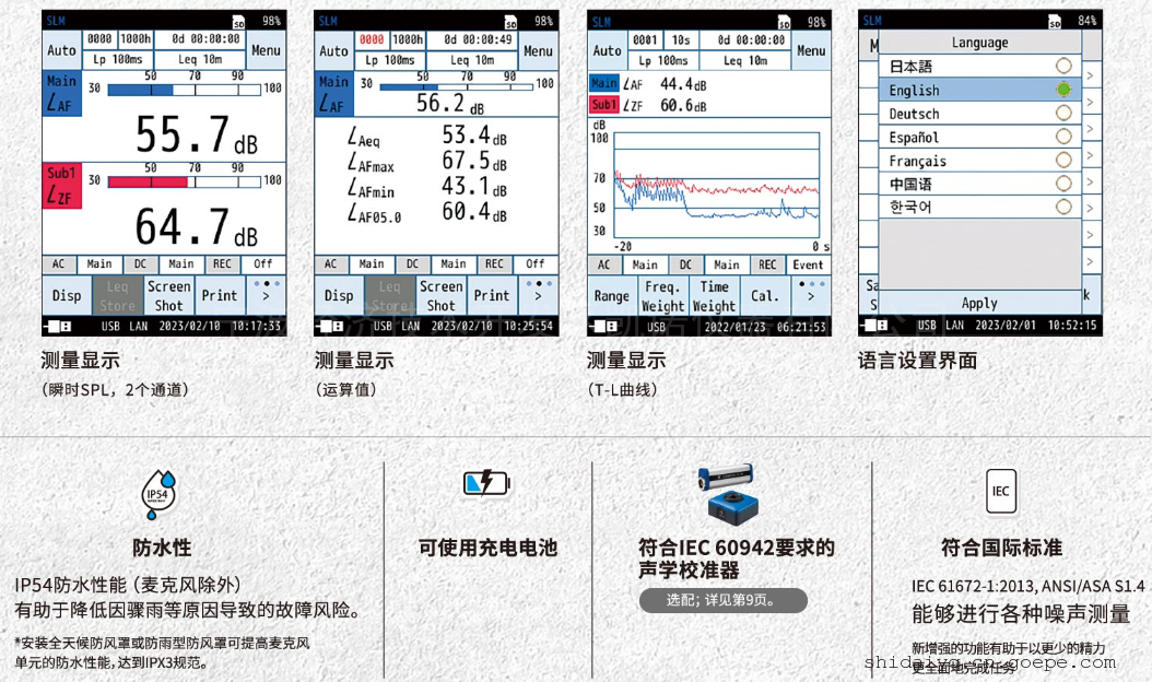 6.单台声级计可以同时测量多达4 种不同设置条件,减少用户的工作时间。